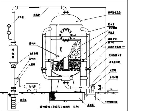 4、水中含有微量錳也會直接對纖維、染色、攝影膠卷、淀粉,釀造業(yè)產(chǎn)生影響。二、工作原理 含鐵(錳)的地下水經(jīng)沖氣或加入氧化劑后,水中鐵(錳)離子開始氧化,當水流經(jīng) 除鐵錳過濾器的錳砂濾層時,在濾層中發(fā)生接觸氧化反應(yīng)及濾料表面生物化學作用和物理截留吸附作用,使水中鐵(錳)離子沉淀去除。