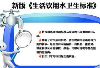 2007年7月1日,由國家標(biāo)準(zhǔn)委和衛(wèi)生部聯(lián)合發(fā)布的《生活飲用水衛(wèi)生標(biāo)準(zhǔn)》(GB 5749-2006)強(qiáng)制性國家標(biāo)準(zhǔn)和13項(xiàng)生活飲用水衛(wèi)生檢驗(yàn)國家標(biāo)準(zhǔn)將正式實(shí)施。這是國家21年來首次對1985年發(fā)布的《生活飲用水標(biāo)準(zhǔn)》進(jìn)行修訂。