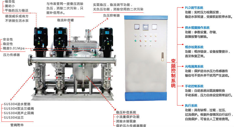 消防增壓穩(wěn)壓設備亮點介紹: 1、節(jié)能:節(jié)省空間,無需建泵房,節(jié)省投資,安裝工期短。 2、環(huán)保:該設備的泵組是設計在泵房里,在運行過程中,極大的降低了運行噪音及振動,噪音≤65dB。 3、安裝方便:該設備為成套設備,設計簡單、拆裝方便,可二次拆裝,成套移位。避免了以往設備的零散占地面積大等不利因素。 4、一旦有火情發(fā)生,系統(tǒng)水壓從PS1下降到P2時輸出啟動消防水泵信號和聲光報警,當消防主泵啟動后返回信號切斷穩(wěn)壓泵的控制電源,之后由手動恢復控制功能。 5、磁翻板液位計就地顯示高低液位,并遠傳高低液位信號,使設備能夠在低水位時停機且聲光報警,到高水位時自動復位。 6、維護檢修方便。